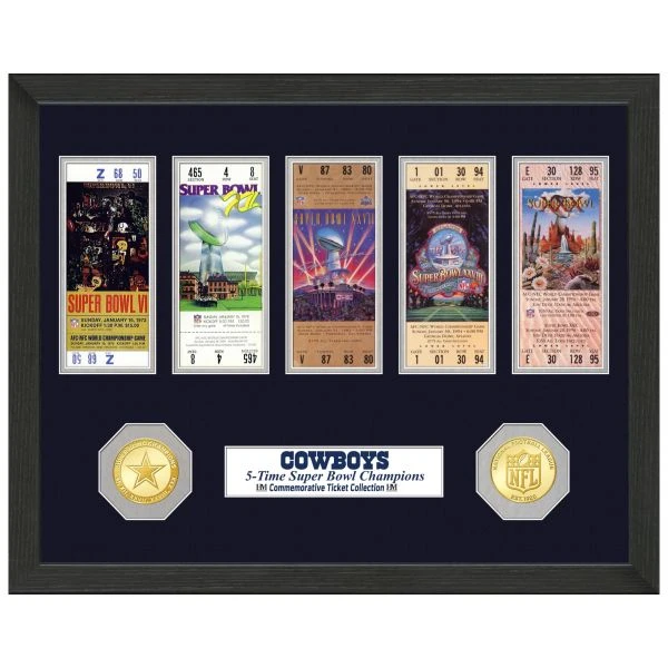Unter den Tickets sind zwei solide Bronzemünzen mit einem Durchmesser von 39mm angebracht. Eine Team Münze und eine Super Bowl Champs Münze.