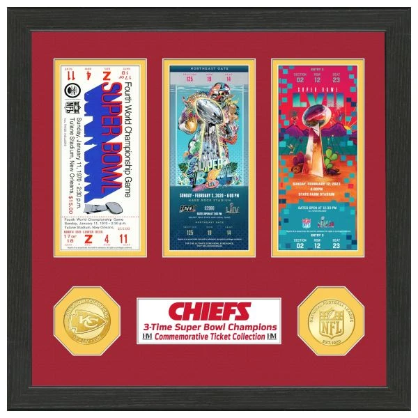 Unter den Tickets sind zwei solide Bronzemünzen mit einem Durchmesser von 39mm angebracht. Eine Team Münze und eine Super Bowl Champs Münze.