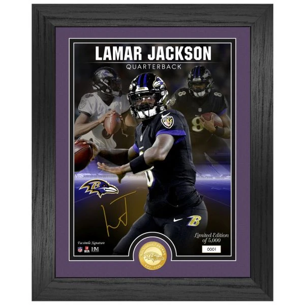 Der 40×33 cm große Rahmen ist verglast und beinhaltet ein 25x20cm großes Foto von Lamar Jackson.