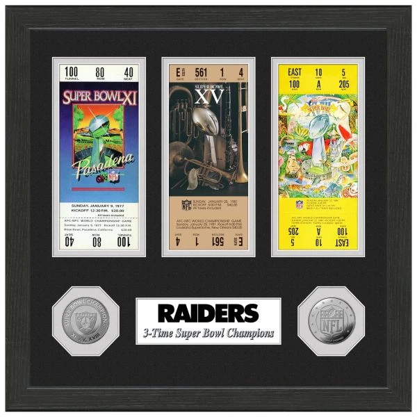 Der 30x30cm große Rahmen ist verglast und beinhaltet Replica Eintrittskarten zum Super Bowl Spiel.