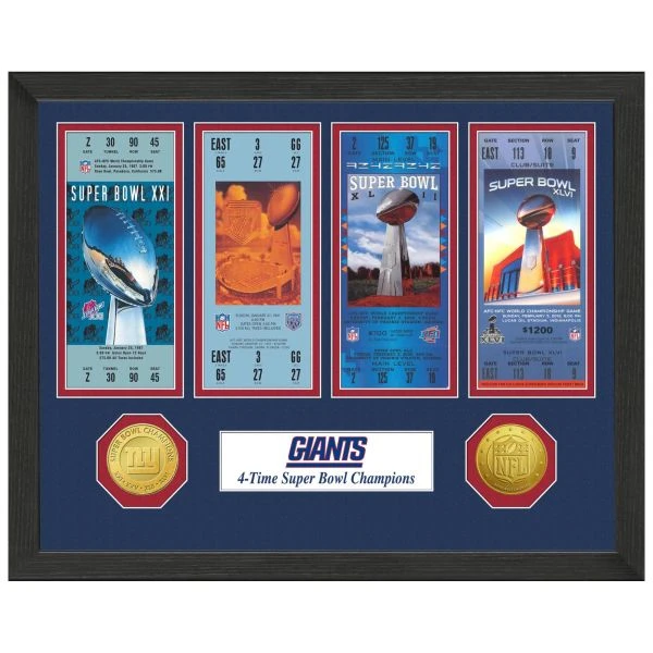 Unter den Tickets sind zwei solide Bronzemünzen mit einem Durchmesser von 39mm angebracht. Eine Team Münze und eine Super Bowl Champs Münze.