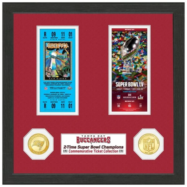 Unter den Tickets sind zwei solide Bronzemünzen mit einem Durchmesser von 39mm angebracht. Eine Team Münze und eine Super Bowl Champs Münze.